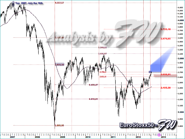 De’ corsi affanni compenso avrai? Mutuando, anche un po’ ingenerosamente, una delle più celebri romanze de La Traviata verdiana (la famosa Parigi, o Cara) e “traslando” Parigi nell’Europa tutta, ecco che si ottiene un quadro abbastanza fedele dello “scabro paesaggio”, nell’attuale momentum storico; quanto affannoso (quasi di manzoniana memoria*) soltanto i veri posteri potranno poi sentenziarlo. Ciò non toglie che sia stata un poco la litania del 2010/11, il grande memento del 2012 e allora lo sarà anche di questo 2013, giunto appena alle battute iniziali? Fuori o dentro dal/al l’€? O insieme per la vita e a difenderlo sine die come per voce di Mario Draghi, a fine Luglio?… fatto peraltro già commentato a suo tempo! Quest’anno, l’embrione che fu – di Comunità Europea – festeggerà il suo 56° compleanno (risale infatti al 1957 il Trattato di Roma che la istituì), sebbene più di 60 ne compirebbe il primo organo con reale entità sovranazionale, ossia la famosa CECA, che non è l’attuale Repubblica :-), ma la Comunità Europea del Carbone e dell’Acciaio (in seguito fusasi con la CEE e l’EURATOM), nata e sottoscritta in occasione del precedente e grandemente precursore Trattato di Parigi del 18 Aprile 1951 (da qui, la vera traslazione del “Parigi, o Cara” in “Europa, o Cara”), per iniziativa di due illuminati statisti francesi e poi entrata in funzione l’anno seguente. Soltanto successivamente, sei anni dopo, si arrivò appunto al Trattato di Roma, come sopra accennato, del 25 Marzo 1957. Sto rammentando ora e velocemente tutta questa cronistoria, giustamente per sottolineare la ferrea volontà – grande e inarrivabile utopia? – di “condivisione economica” che ispirò i Padri Fondatori di allora (non a caso la prima unione fu tipicamente e prettamente industriale, dunque cifra precisa, del processo di ricostruzione in atto), congiunta alla notoria necessità di debellare e sconfiggere prima le guerre (prima di combatterle!), dopo lo scempio e lo sconquasso che erano sotto gli occhi di tutti, al termine del Secondo Conflitto Mondiale. Da allora, però, in un vizioso e men che virtuoso “crescendo” rossiniano, la “temuta guerra” si è spostata sempre più sul campo finanziario e calzerebbe benissimo il detto francese: «C’est l’argent qui fait la guerre!» (“sono i soldi a crear la guerra!”). Col crescente benessere, tutti hanno potuto essere un poco partecipi di queste piccole o grandi battaglie e anche l’Unione volle suggellare sotto questa bandiera la fine dei conflitti finanziari, con la sottoscrizione del Trattato di Maastricht (prettamente finanziario, ma non fiscale, etc. e dunque ecco servito il “grosso guaio a Maastricht”, ancora purtroppo in atto), ormai maggiorenne anch’esso – e secondo persino la vecchia legge! –, poiché compirà tra pochi giorni proprio i 21 anni, risalendo ormai al 7 Febbraio 1992. Un figlio da alcuni però ricusato (v. Danimarca), da altri inviso e reietto. E il quesito che ora in tanti si pongono è realmente: «È mai cresciuto costui, dopo esser nato, pur avendo raggiunto la piena maturità?». Quasi per assurdo, da quest’ultima fase dell’Unione – la quasi finale – sono derivati i peggiori guai, i peggiori conflitti finanziari che la storia recente e lontana possa annoverare. E hanno toccato il loro apice e climax proprio nel corso di questo ancora recente e fremente 2012, durante il quale , sul baratro, si sono affacciate Grecia, Portogallo, Spagna e, ultima – e ahinoi! –, anche la nostra Italia. Sull’indice FTSE-Mib e di quanto abbia perso in questi anni, sia in senso assoluto sia in senso relativo (nei confronti, per esempio, proprio del DAX), si conosce ormai praticamente tutto, ma di come si posizioni l’indice forse più rappresentativo e “sintetico” di tutt’Europa (lo EuroStoxx50) e in senso assoluto, spesso si conosce un po’ meno, magari perché troppo affaccendati con le domestiche vicende… Lo stesso EuroStoxx50 segnò il suo massimo storico nel 2000, il 6 Marzo, a quota 5.464.63. Nel 2007, tentò di riavvicinare quei livelli, ma si fermò estatico in una notte d’estate, il 16 Luglio, a quota 4.557,57, fallendogli dunque dal recuperare ancora quasi un 20%, più precisamente, il 19,90%. Un po’ la stessa sorte che toccò al nostro indice, allora e ancora Mib30 e poi S&PMib40. Da tutti questi passaggi e miscugli anche un poco raffazzonati, risulta che il massimo (sempre del 6 Marzo) fu segnato appena sopra quota 50.000, a 50.106,56 (in realtà allora non c’erano i decimali e questo dato sortisce dall’applicazione di una qualche rettifica, poiché, personalmente, ricordo un FIB fin verso quota 52.000… accetto volentieri contributi di altri ricordi, da parte di chi legge ;-) e invece, nel 2007, si fermò il 18 di Maggio, a 44.364 punti, mancando così di recuperare “soltanto” (confrontato con lo EuroStoxx50 appena “scannerizzato”!) un 12,94% ovvero sette punti percentuali in meno. Oggi, la situazione si è pressoché capovolta e con cifre ben più grandi. Il quadro attuale è dunque così riassumibile, quando confrontato con i rispettivi massimi del 2007: • EuroStoxx50 – Last in Close @ 2.717,79 e pertanto con un 67,69% da recuperare per raggiungere i livelli di cinque/sei anni fa; • FTSE-Mib – Last in Close @ 17.502,39, dunque con un immenso 153,47% da recuperare per raggiungere medesimi livelli e sempre di cinque/sei anni fa. Eppure, in questo 2013, le performance – ritengo – si faranno proprio in quest’area (Euro) e magari sui paesi più colpiti negli anni precedenti. • 1° motivo: la stessa configurazione di avviata great recovery in cui versano gli indici stessi, a partire proprio dal FTSE-Mib e sino allo EuroStoxx50, del quale ultimo si vede qui rappresentato un chart partente proprio dai massimi del 2007 e sino a oggi. ![]() Il grafico, realizzato secondo i più puri dettami delle mie Fibonacci Waves ev