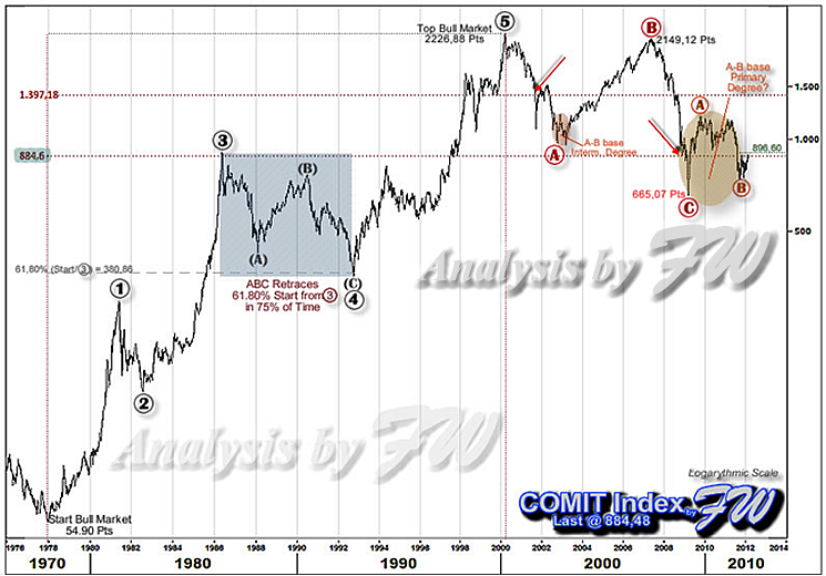 Non Sei la Grecia? Allora Dimostracelo! Ho ricevuto alcune e-mail a proposito della situazione tecnica della Borsa italiana. Ho ricevuto alcuni quesiti, alcune letture esperite applicando Elliott che suggerivano una risposta che non potevo fornire sic et simpliciter. In primis, anche perché analizzare "soltanto con le onde di Elliott classiche" gli ultimi movimenti del FTSE-Mib è pericolosissimo: se non si tiene bene in considerazione quello (il tanto) che precede gli ultimi due anni, potrebbe addirittura condurre a interpretazioni talmente distorte da lasciare comprendere l’esatto contrario. Se invece, si applica l’Elliott "riletto" – come in parte nel mio libro – si potrebbe arrivare a conclusione quasi vicine alla (a una possibile) verità. Infine – lo sapete – Elliott da solo, lo uso davvero raramente, se non con un tassativo raffronto face to face con i riscontri derivanti dalle mie fide e devote (e io a loro!) Fibonacci Waves. Sapete anche che non amo il mercato italiano. Non è ovviamente per partito preso (lungi da me); ho le mie buone ragioni (sempre puramente tecniche). Sarò anche pronto a divenire più positivo sul nostro mercato e conoscete già qual è il primo requisito richiesto. Ci saranno poi anche altre ragioni, ma le vedremo si concretassero in fatti reali. Ho dunque cercato di condensare in un unico grafico tutte le sensazioni che si traggono da una sua profonda osservazione, per fornire una (almeno parziale) risposta a quanti mi hanno posto il quesito. Per compiere un’analisi davvero profonda, poi, va da sé che bisogna cercarla nella storia e in ragione di ciò – per quanto distorto dai profondi e radicali cambiamenti dal panorama economico italiano – lo UNICO indice che consente appunto una "Analisi Storica" è il sottoriprodotto Comit Index, oggi ancora calcolato e cha partì dal 1973 con base=100. ![]() Ed ecco come si presenta oggi il grafico del COMIT Index, con le 5 Onde di impulso, dal 1978 al 2000, e il successivo impianto correttivo, più la possibile formazione in A-B base (2009-To-Date). Da notare la straordinaria vicinanza dei livelli attuali a quelli che furono i massimi del 1986. Per uniformità di lettura, diremo che oggi: • lo stesso COMIT vale (a venerdì) 884,48 punti, contro • un FTSE-Mib a 16.547 punti, dunque in rapporto di 1/0,053. Sui massimi di maggio 2007, i due stessi indici valevano: • il primo 2.149,12 punti (chiusura 18/05/2007); • il secondo (che all’epoca era ancora S&PMIB) 44.364 punti, e dunque in rapporto di 1/0,484 (per valere lo stesso ratio, il COMIT sarebbe dovuto essere a 2.367 punti (ciò può essere spiegato dalla miglior performance "in salita" dei titoli a più alta capitalizzazione). Ancora e infine, sui minimi di marzo 2009, • il primo prezzava 655,07 punti (chiusura 09/03/2009); • il secondo, 12.621 punti (stessa data), dunque in rapporto di 1/0,519 e per valere lo stesso ratio iniziale (dunque di oggi!) di 1/0,053, il COMIT sarebbe dovuto essere a 673,52 punti. Pertanto e in conclusione, dai massimi del maggio 2007 • il primo ha perduto al momento un 58,84%; • il secondo un 62,64%. Ho semplicemente desiderato riportare questi dati, per comprendere che pretendere di compiere un raffronto perfetto tra i due indici non è esattamente possibile, ma proprio per questo ora vedremo il singolo Comit Index, quasi come "Il FTSE-Mib non esistesse". Il grafico qui presente – sia ben chiaro – è in scala rigorosamente logaritmica, infatti tentare di applicare Elliott (sui grandi movimenti) senza l’ausilio della Log Scale diverrebbe puro miraggio, nonché demistificazione. E dal grafico qui presente si notano: • le 5 onde sufficientemente regolari (di grado Primary, dunque circle) che caratterizzano il great bull-market degli anni 1978-2000 e che addirittura anticipò quello USA, durato "soltanto" 18 anni e iniziato nel 1982, all’epoca dei Mondiali in Spagna :-)); • la successiva fase correttiva (e dunque di pari grado!), iniziata appunto nel 2000 e che subisce ben due momenti involutivi importanti (frecce diagonali). Al primo si pone rimedio circa 3 anni dopo, ma poi tra 2008/09 vi è la totale negazione con tanto di seconda e ancor più grave involuzione (violazione del 61,80% dell’intero ciclo di bull-market) e tuttora in atto, poiché siamo esattamente a cavallo del punto chiave: 884,48 (di ultima chiusura) contro 884,60 per "rientrare" (valore a sx. nel chart); • a proposito di detta fase correttiva, può notarsi anche la grandissima similitudine con la correzione intermedia in Onda 4 (circle e Primary e composta di un three in Intermediate degree sub-waves) intervenuta tra il 1986 e il 1992, anno in cui esaurì appunto Onda (C) di 4 (circle). In entrambe queste correzioni è sempre presente una Onda B molto "alta", quasi a costruire una correzione in flat, sebbene profondissimo; • ovviamente, di fronte a queste due correzioni, non potrà farsi a meno di notare una grossissima e fondamentale differenza: il primo A-B-C è costituito da onde Intermediate (A), (B) e (C); il secondo A-B-C sarà (con tanta probabilità) costituito da tre onde di grado Primary (dunque circle e di un grado più elevato); • da tutto ciò (volendo ritenere esaurito lo A-B-C – in 3 Primary Wave, costituenti un’onda di grado superiore e Cycle – col bottom del 2009), non può farsi altro che leggere il movimento seguente come un A-B base (cap. 4, II sez. e pagg. 149-175 del mio libro). L’ipotesi di A-B base era già stata avanzata, tramite queste pagine, verso metà Ottobre 2011, (la seconda condizione contenuta in quel documento non è più realizzabile e dunque dovranno considerarsi altri tempi) e – in pura teoria – potrebbe essere portata avanti fino a che il minimo del 2009, a 665,07 punti, dello stesso Indice Comit rimarrà intatto. In qualità di termine di paragone andrà preso il relativo minimo di FTSE-Mib, in area 12.600. L’apparire dello A-B base implicherebbe necessariament